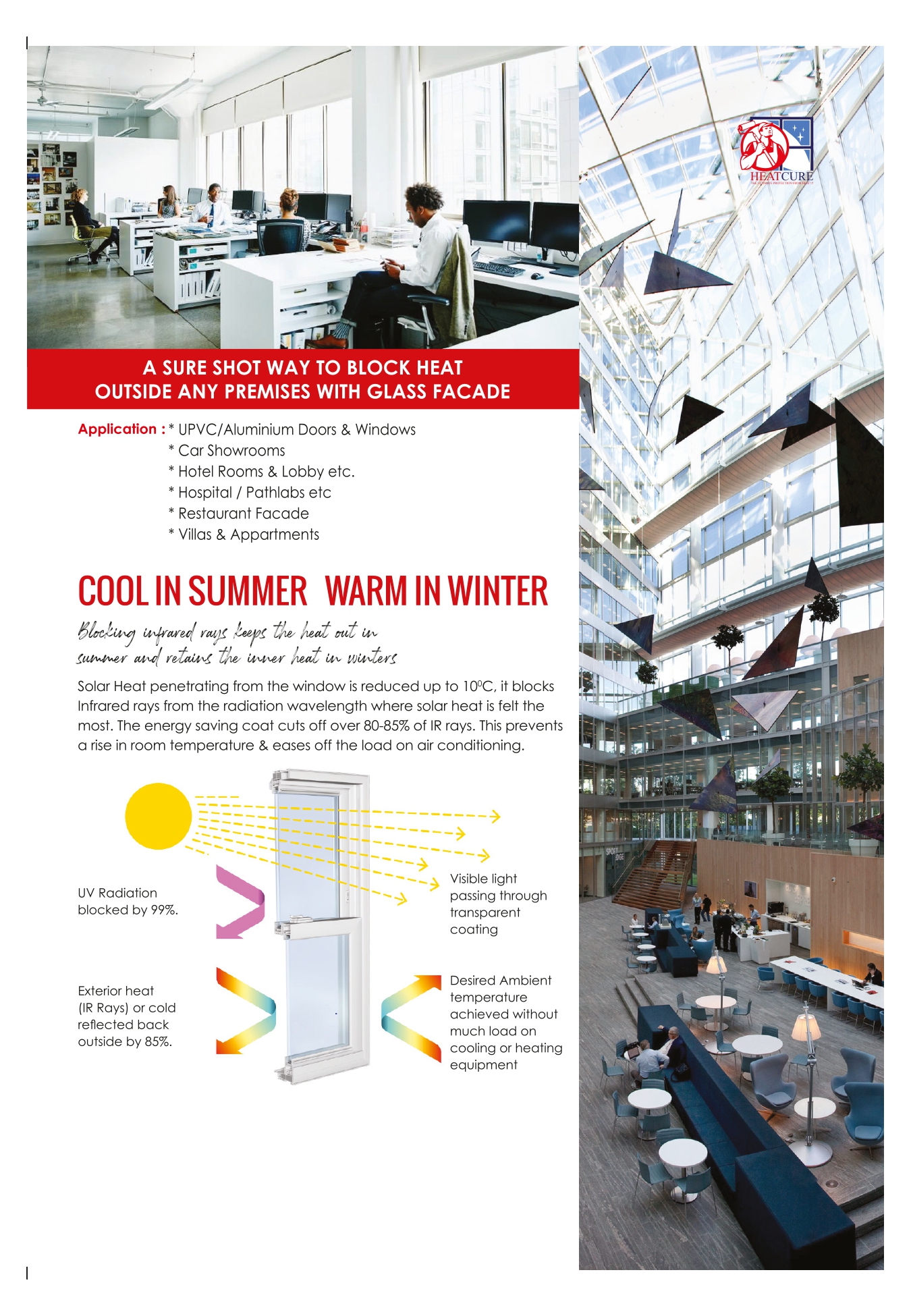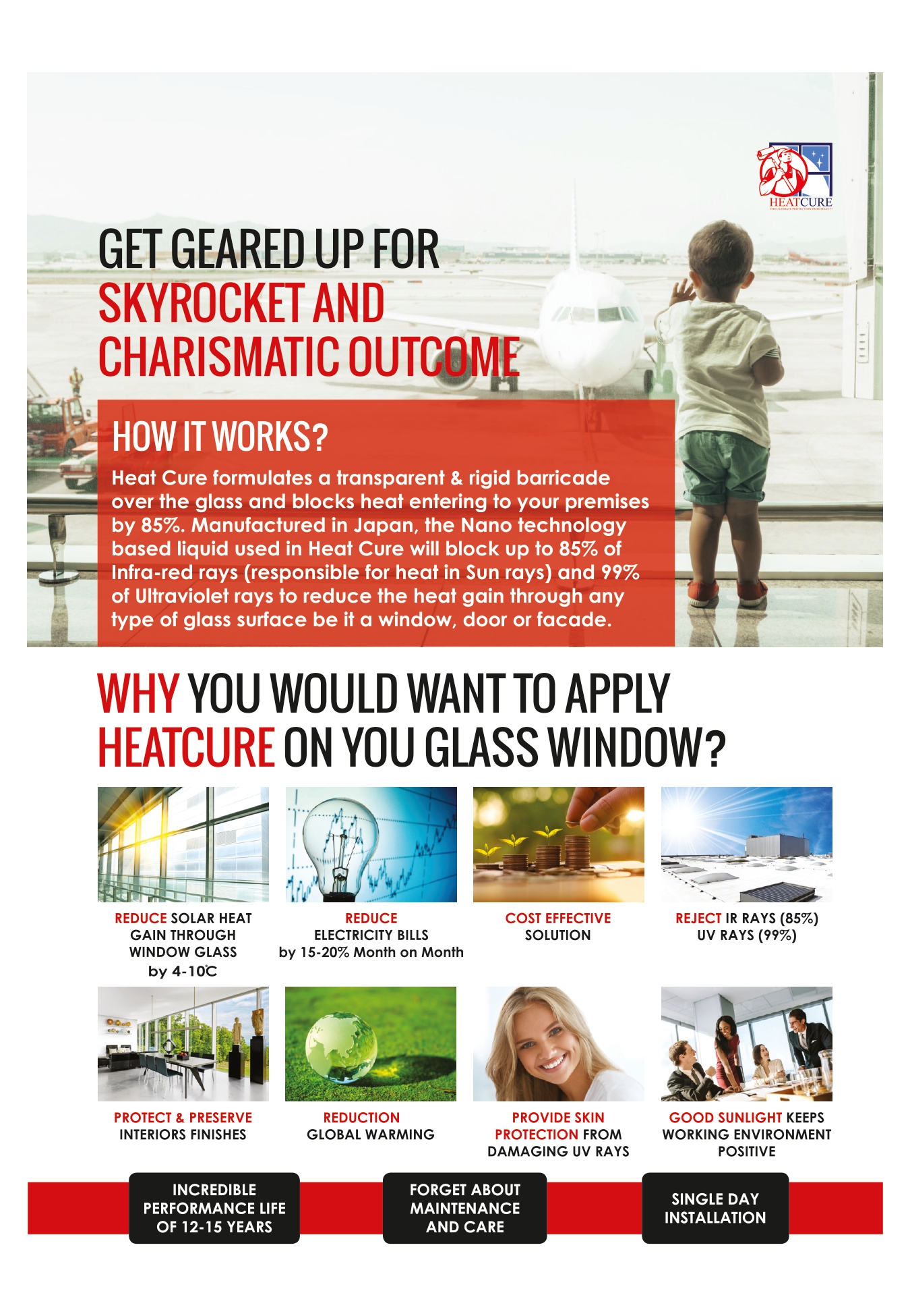 Introducing HeatCure – a game-changer that creates an invisible, super-strong shield on your glass to keep out a whopping 85% of the scorching heat from the sun. It's like magic but powered by super tiny tech called Nanotechnology. This magic liquid in HeatCure can stop 85% of the Sun's hot rays and 99% of the harmful UV rays that make your place hot.
